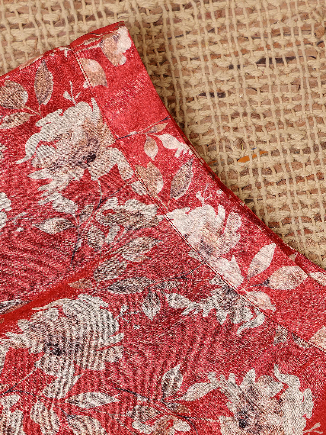 - Maroon and cream-coloured printed ready to wear lehenga, has zip closure, flared hem