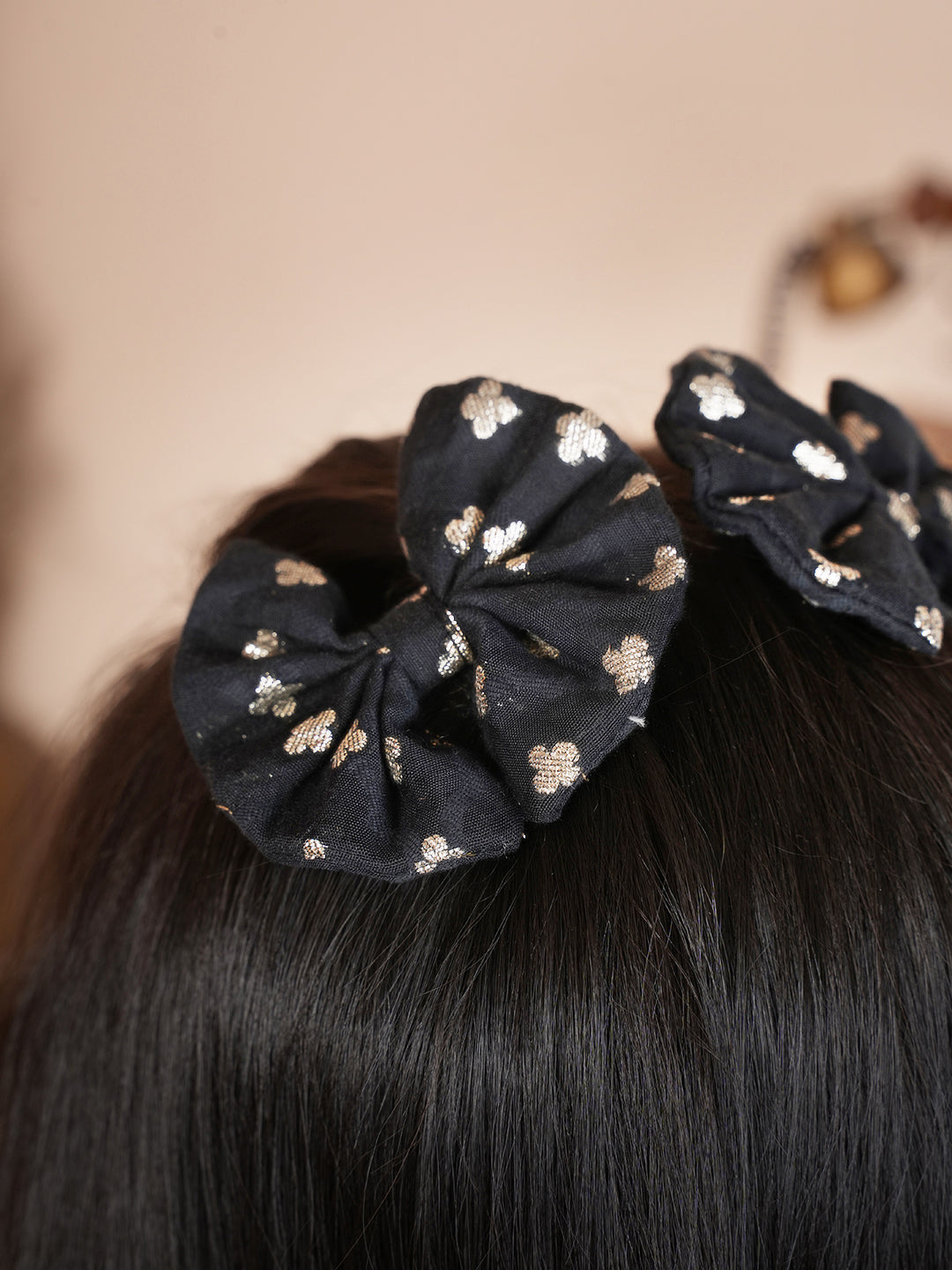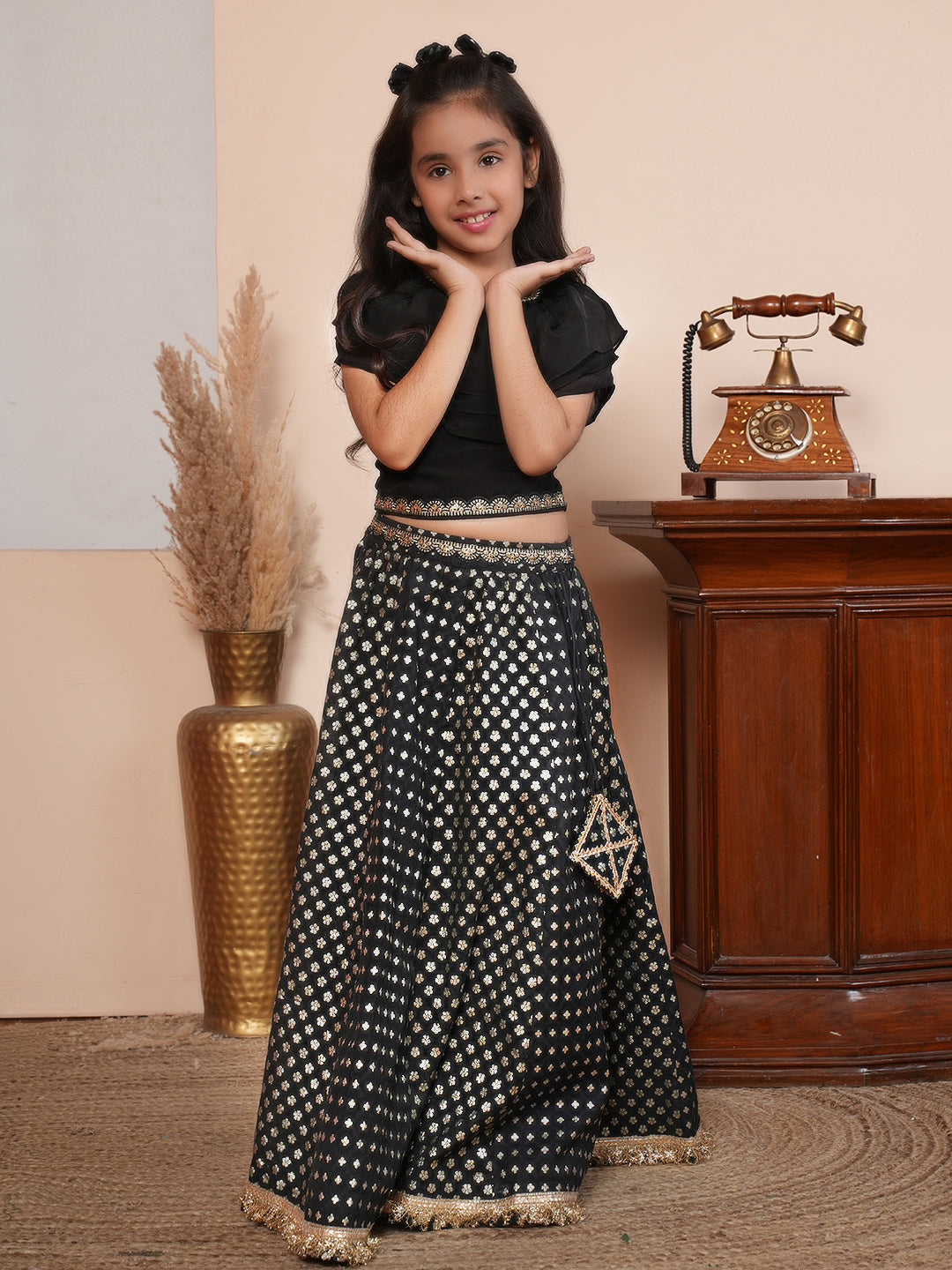 - Black brocade ready to wear lehenga, has zip closure, straight hem
