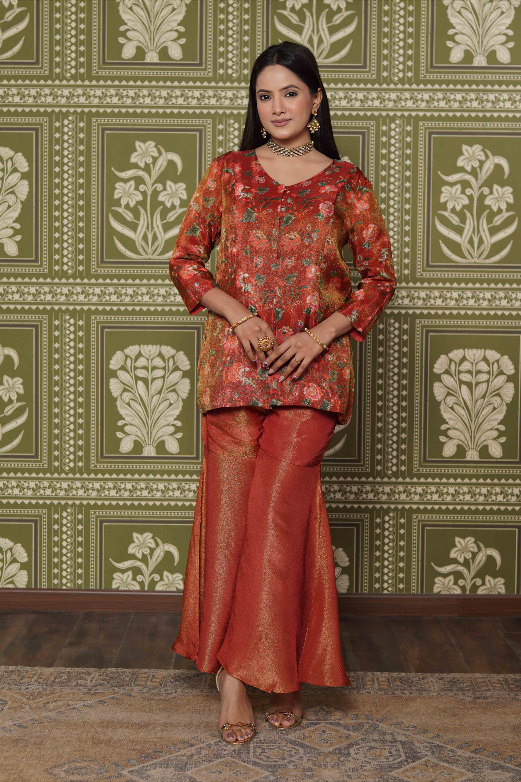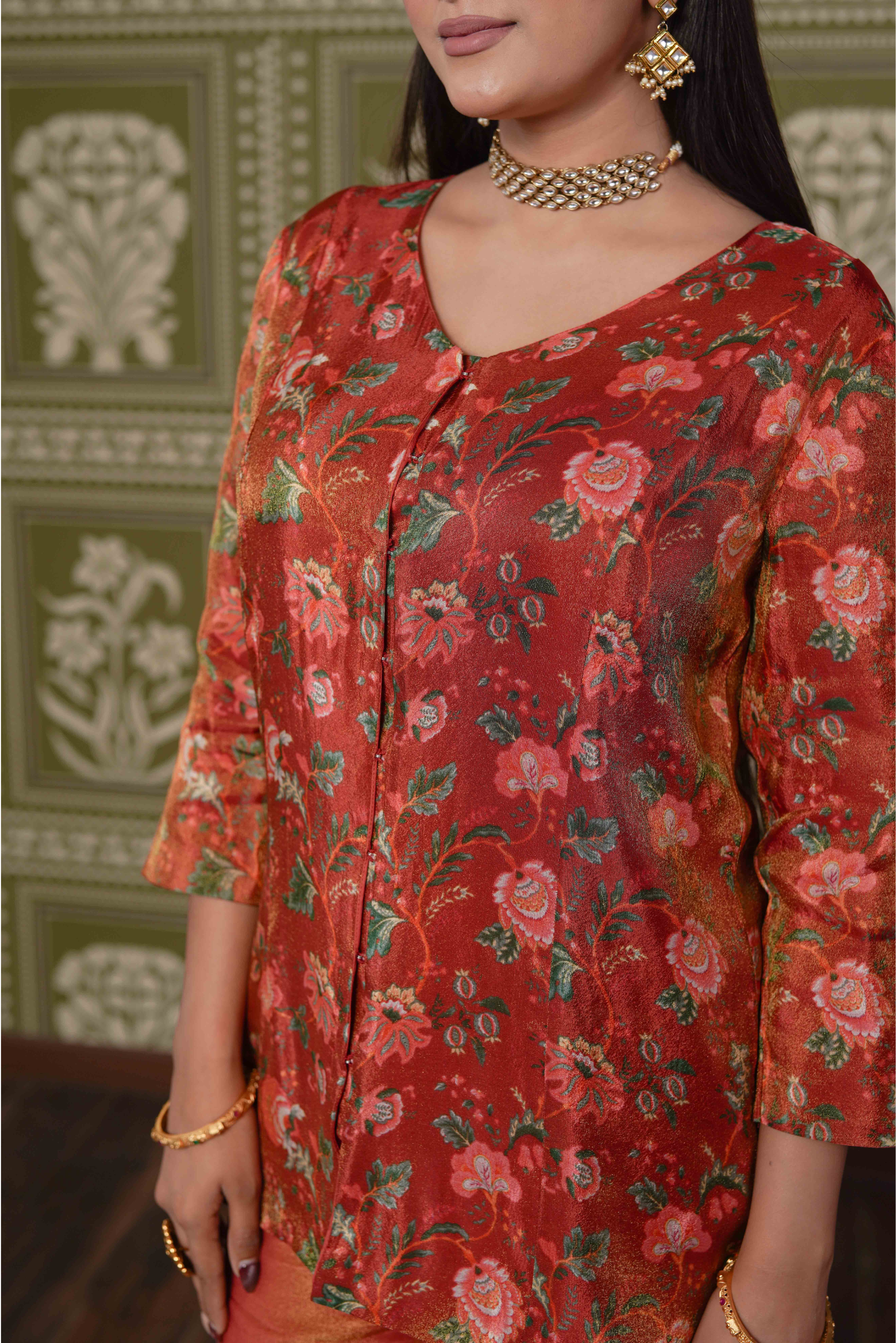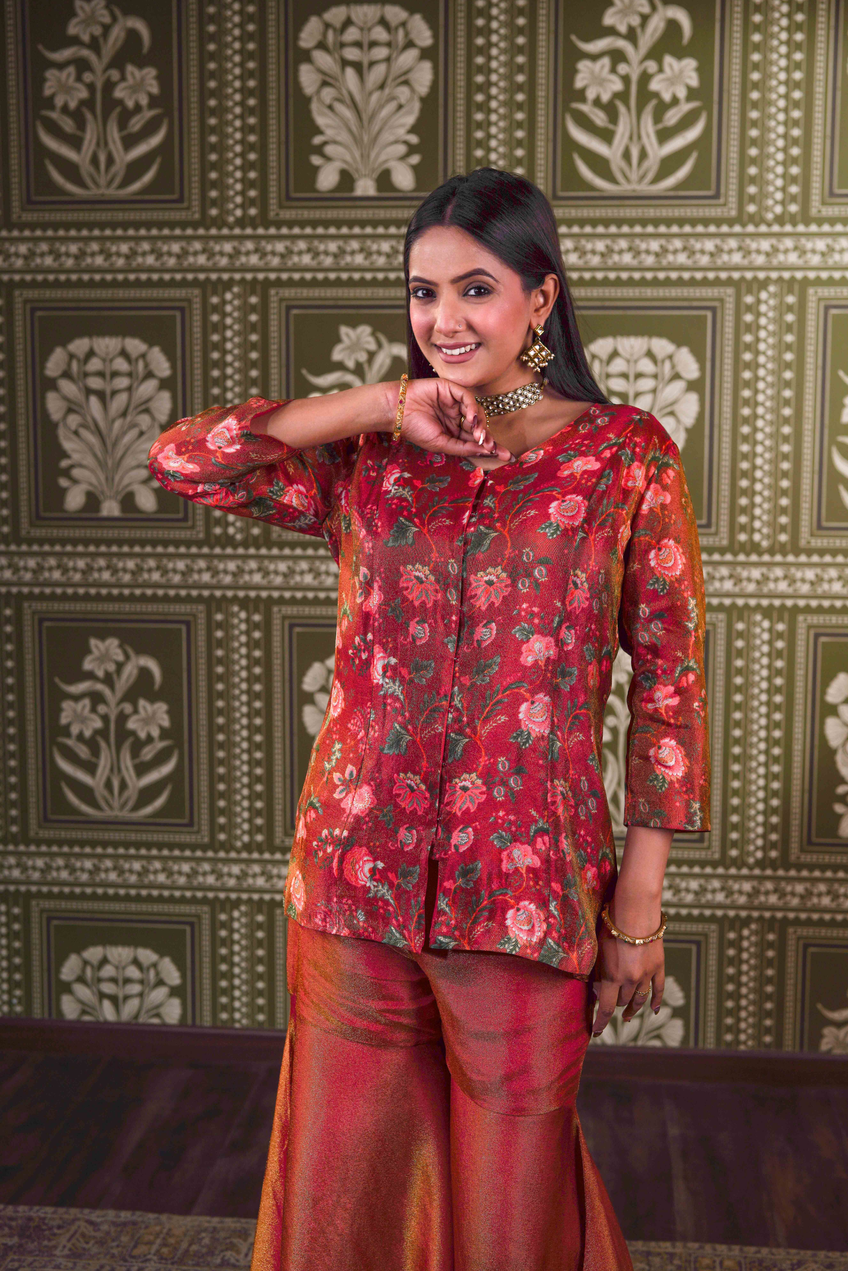 V- NECK FLORAL PRINTED TISSUE RED CO-ORDS SET