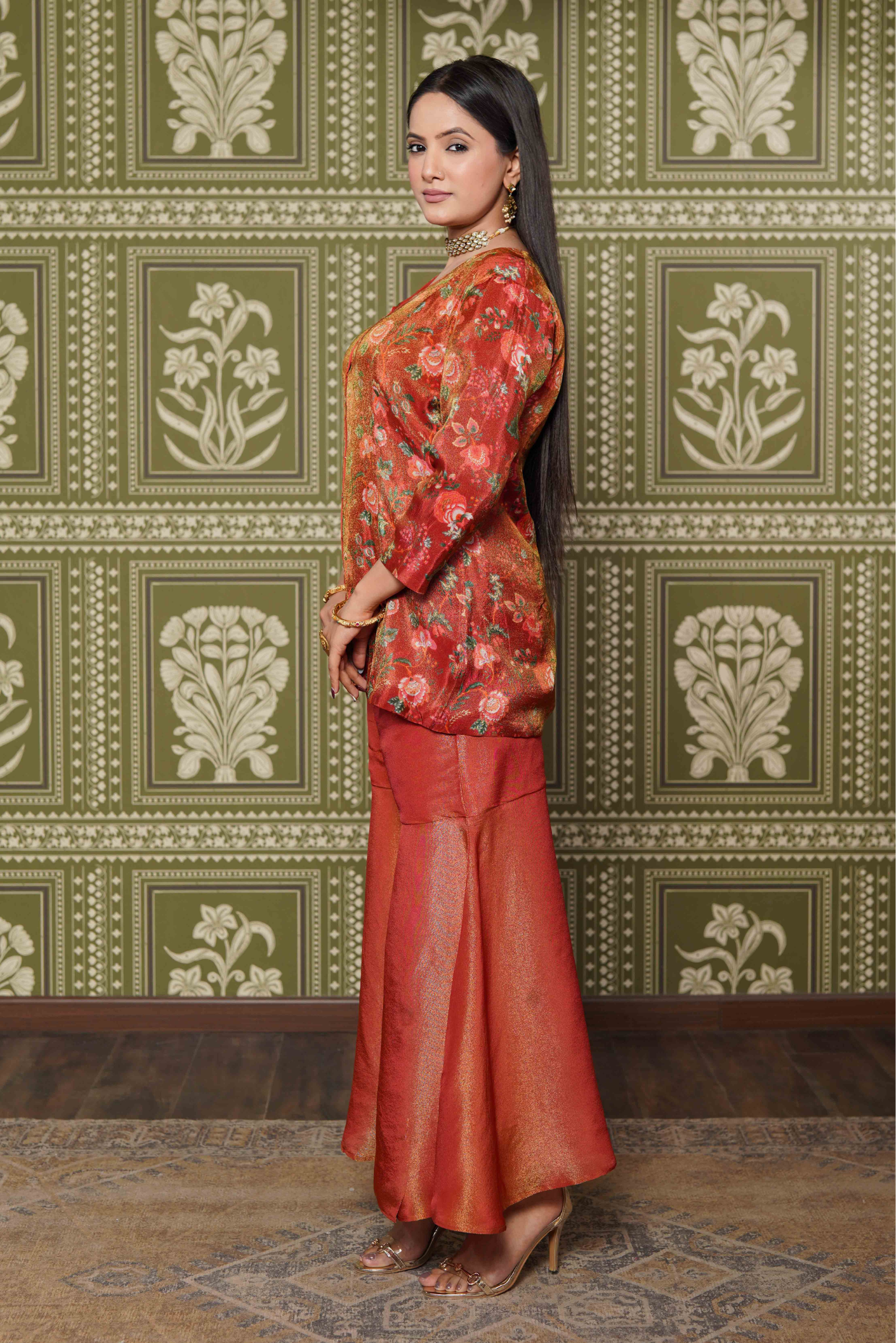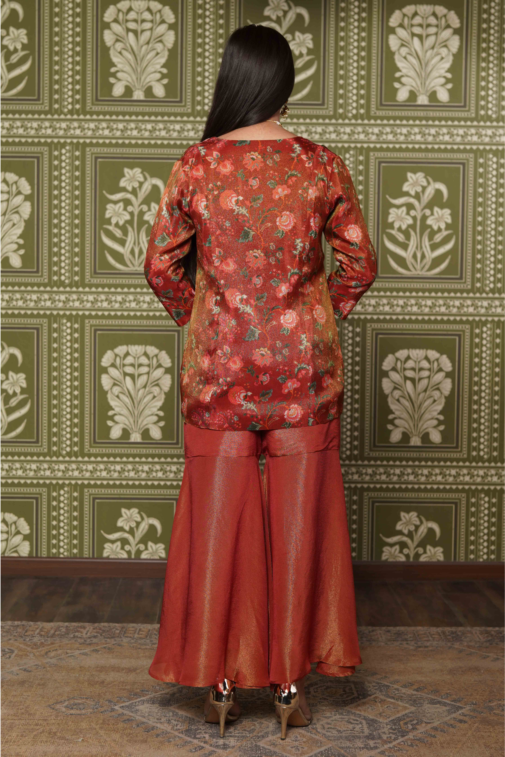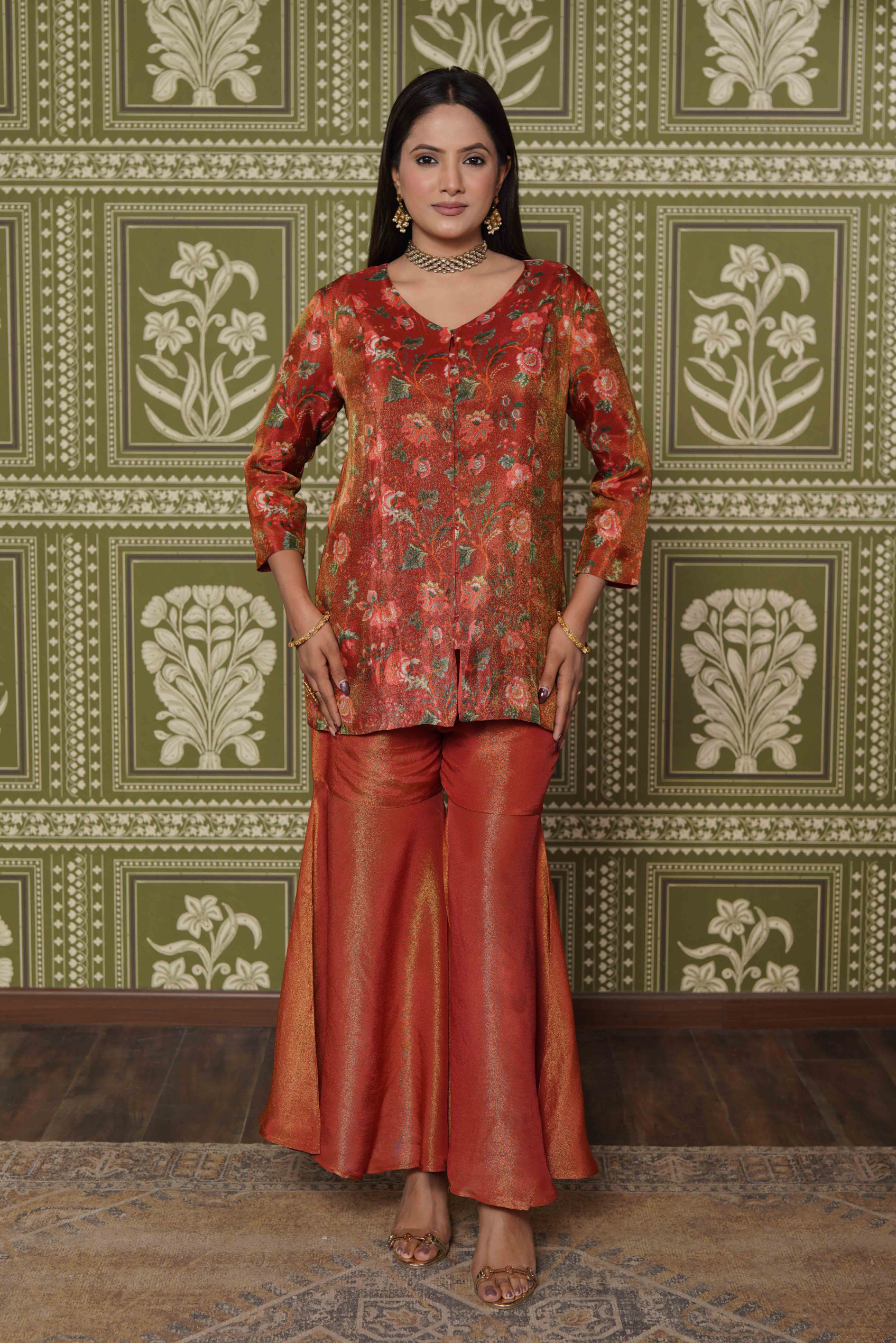 V- NECK FLORAL PRINTED TISSUE RED CO-ORDS SET
