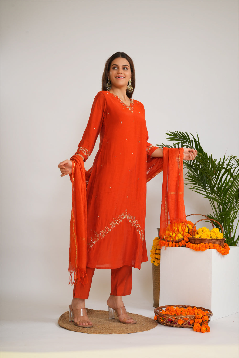 Orange & Gold Embroidered Kurta with Trousers & Dupatta
