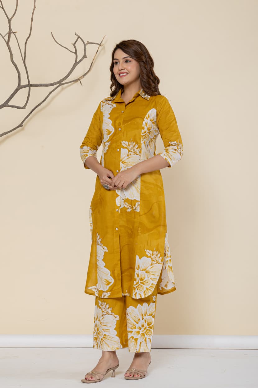 Women Shirt Collar Pure Cotton Kurta with Palazzos